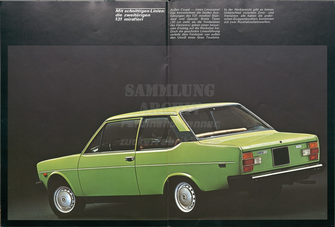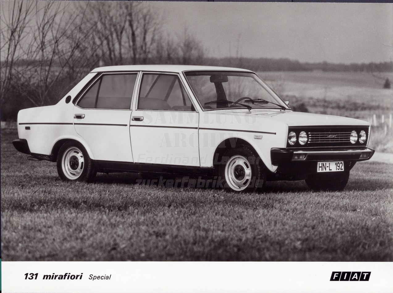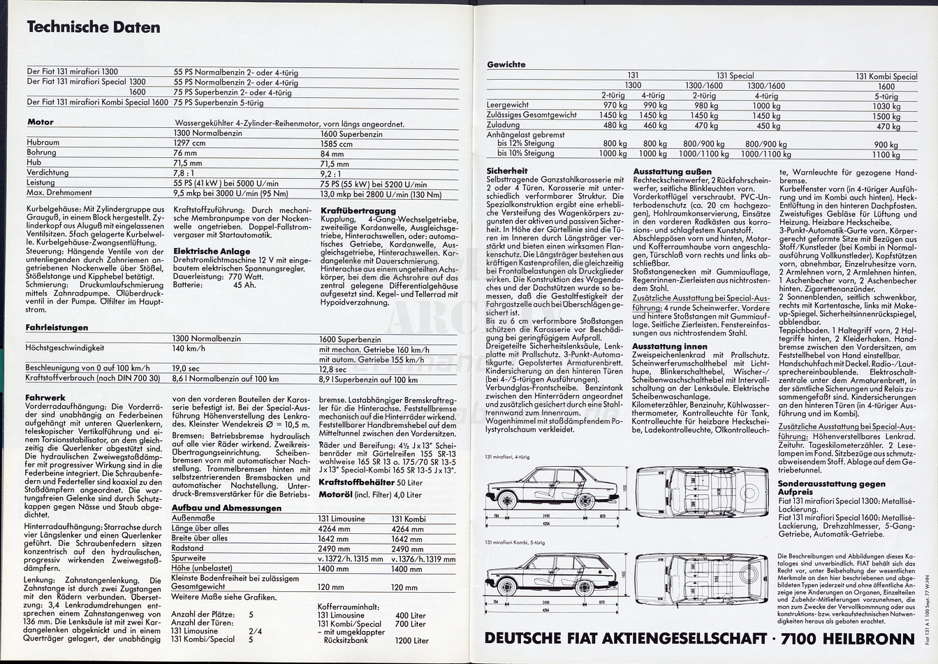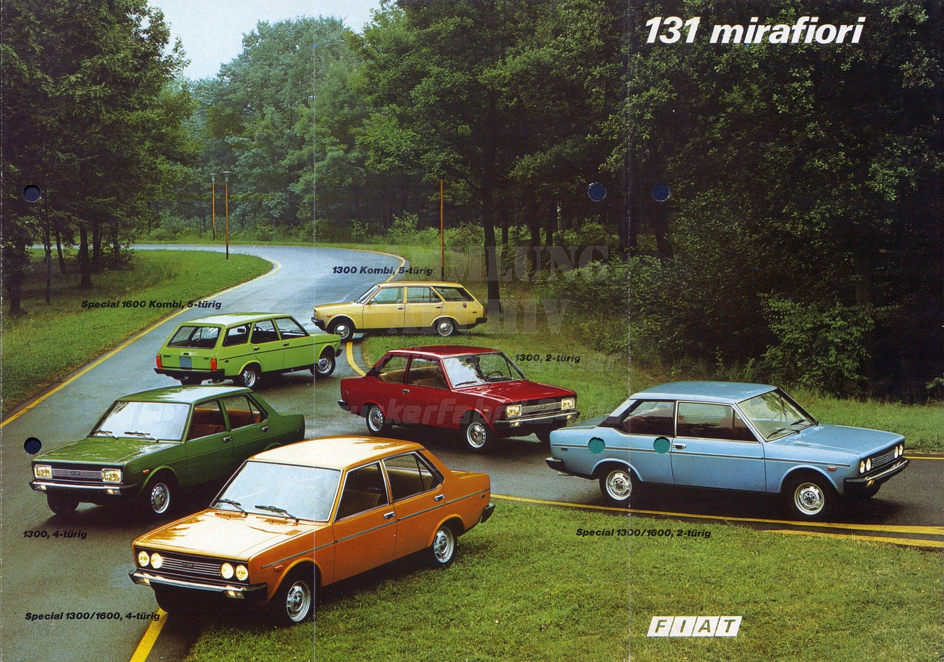 Es gab den 131 Mirafiori als 2- und 4- türige Limousine und als 5-türigen Kombi. Alle Versionen mit 1300 Motor und mit 1600 Motor und in 2 Ausstattungsversionen.