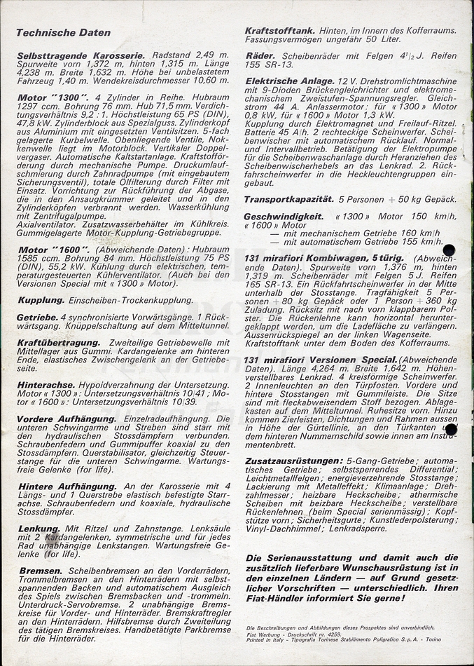 Prospekt Fiat 131 - Nr. 4258 ('74) - mit Aufdruck '8 Versionen' (ca 12-1974) - dt.
