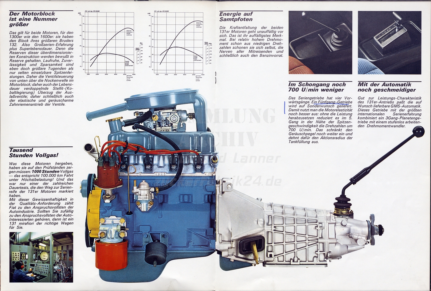 Die ohv Motoren mit 1297 ccm '1300', 55 PS und 1585 ccm '1600', 75 PS, waren von den Fiat 124/132 Motoren abgeleitet (B/H 76/71,5 mm bzw. 84/71,5 mm).