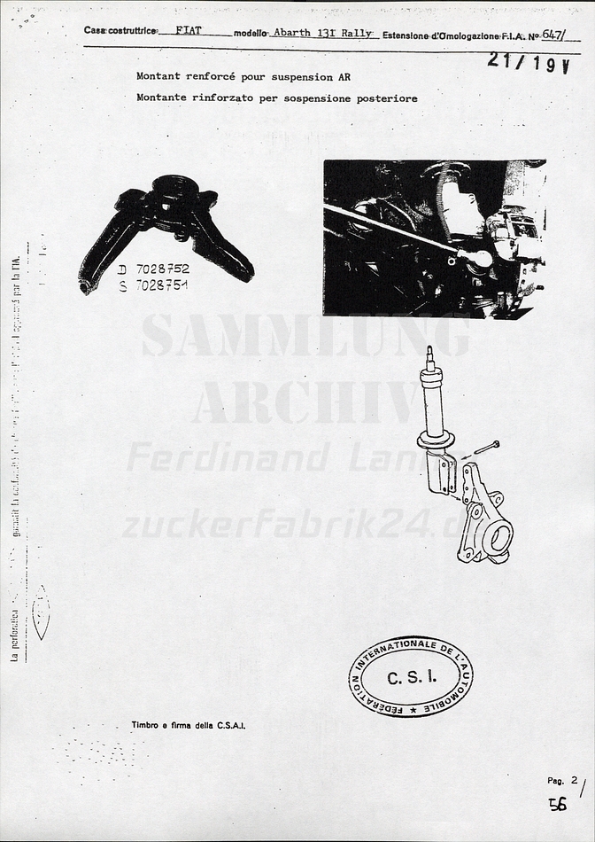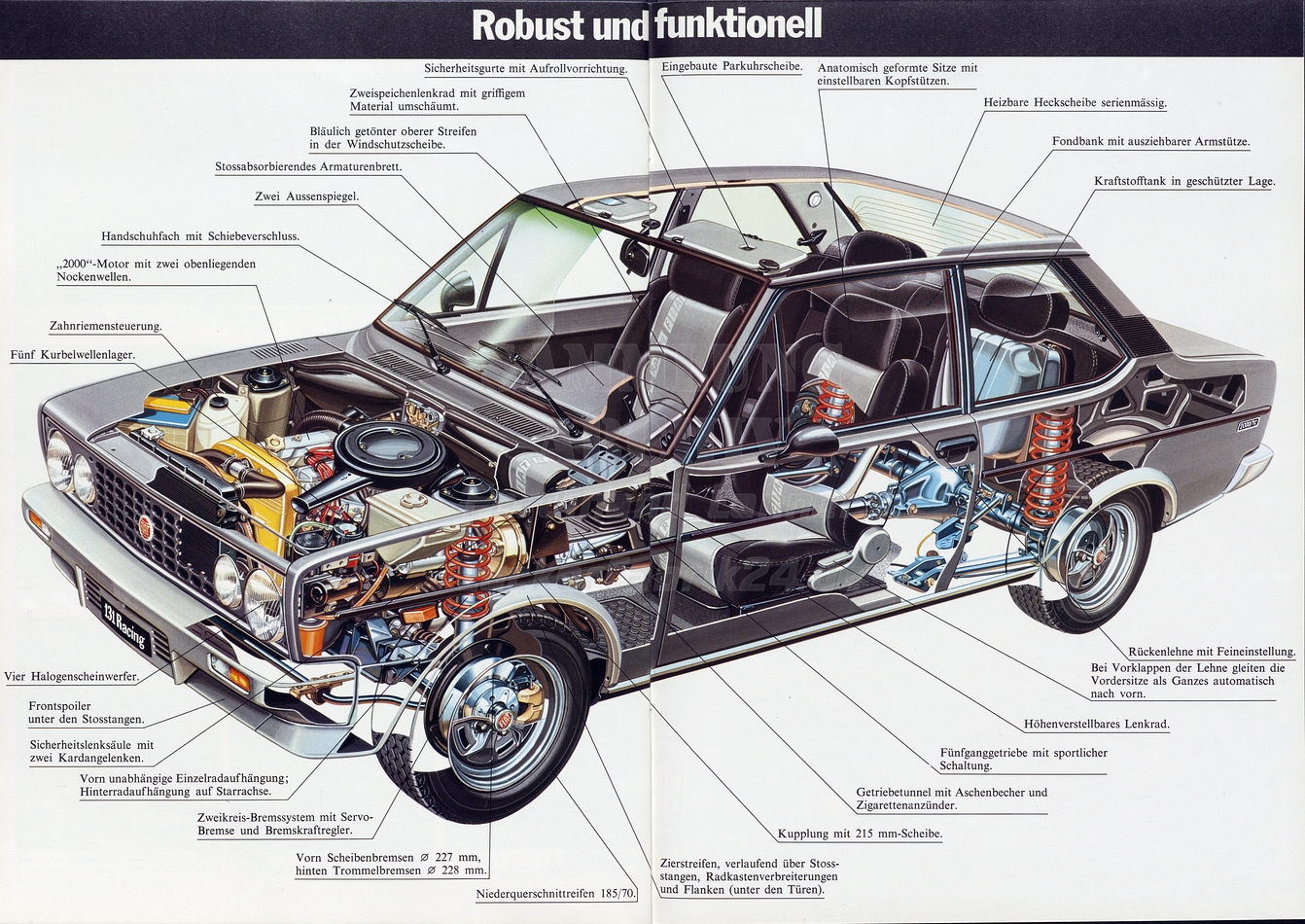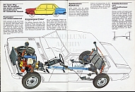 Die Aufhängungen der Vorder- und Hinterräder hatten McPherson Federbeine, also auch hinten unabhängige Hinterradaufhängung, wie schon beim Fiat 124 Abarth Rally. - siehe Prospekt unten. -