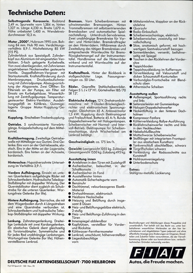 Prospekt Fiat 131 Sport - deutsche Fiat - 11-1978