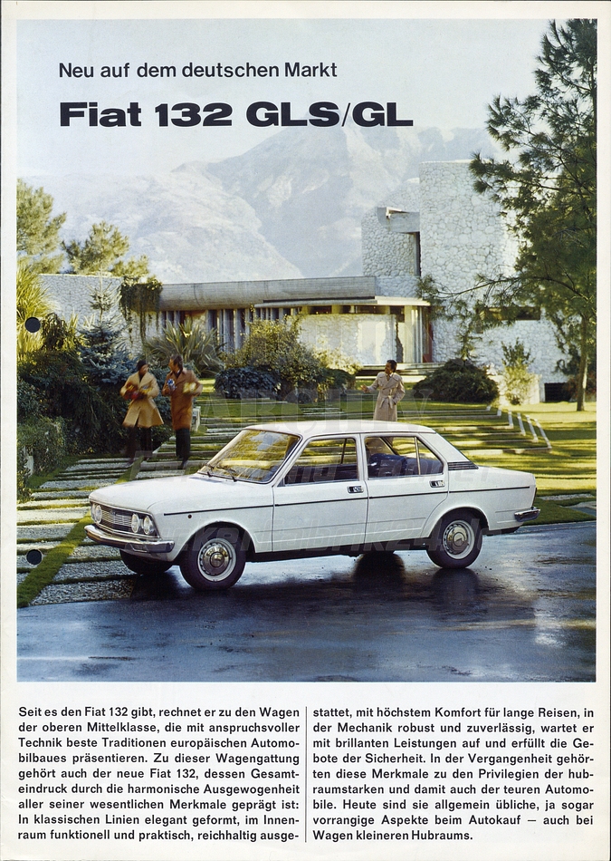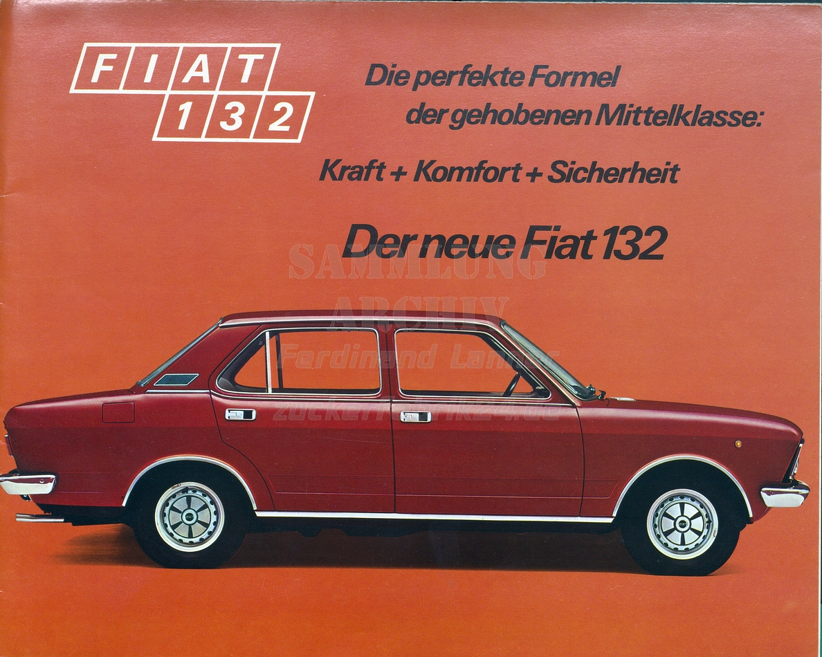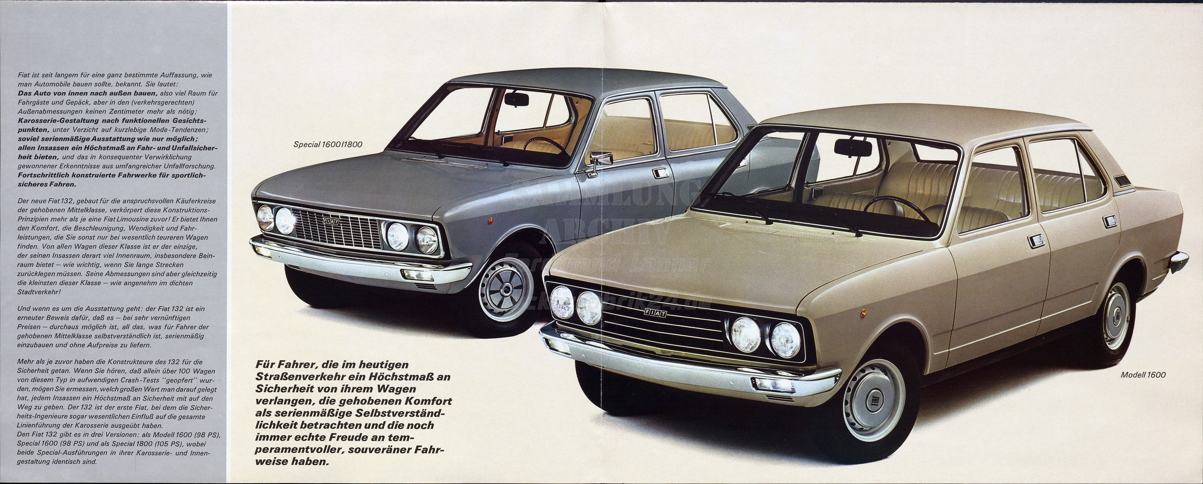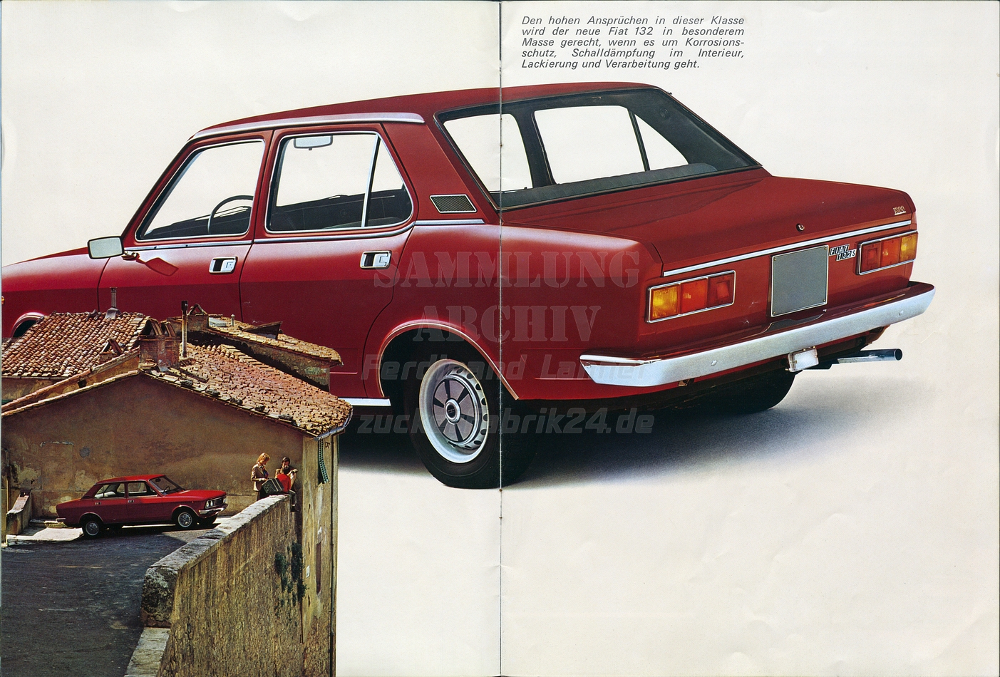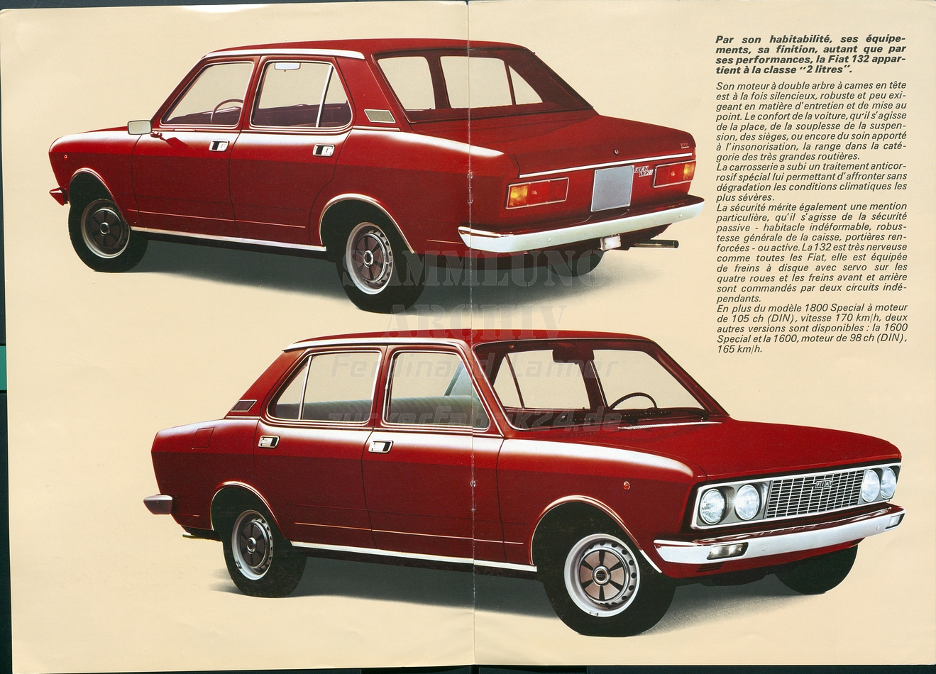 Im Mai 1972 wurde der Fiat 132 mit 1600 und 1800 ccm Motoren als Nachfolger des Fiat 125 und 125 S vorgestellt. Für den Fiat 132 1600 gab es auch eine sparsamere Ausstattung, erkennbar an der anderen Front. - 1974 folgte eine modifizierte Version.