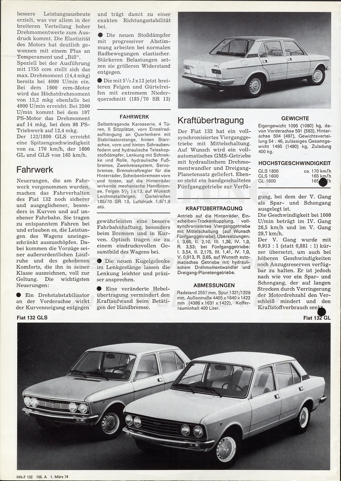 Sonderdruck aus 'Fiat fahren' - deutsche Fiat - Fiat 132 GL/GLS - 1974