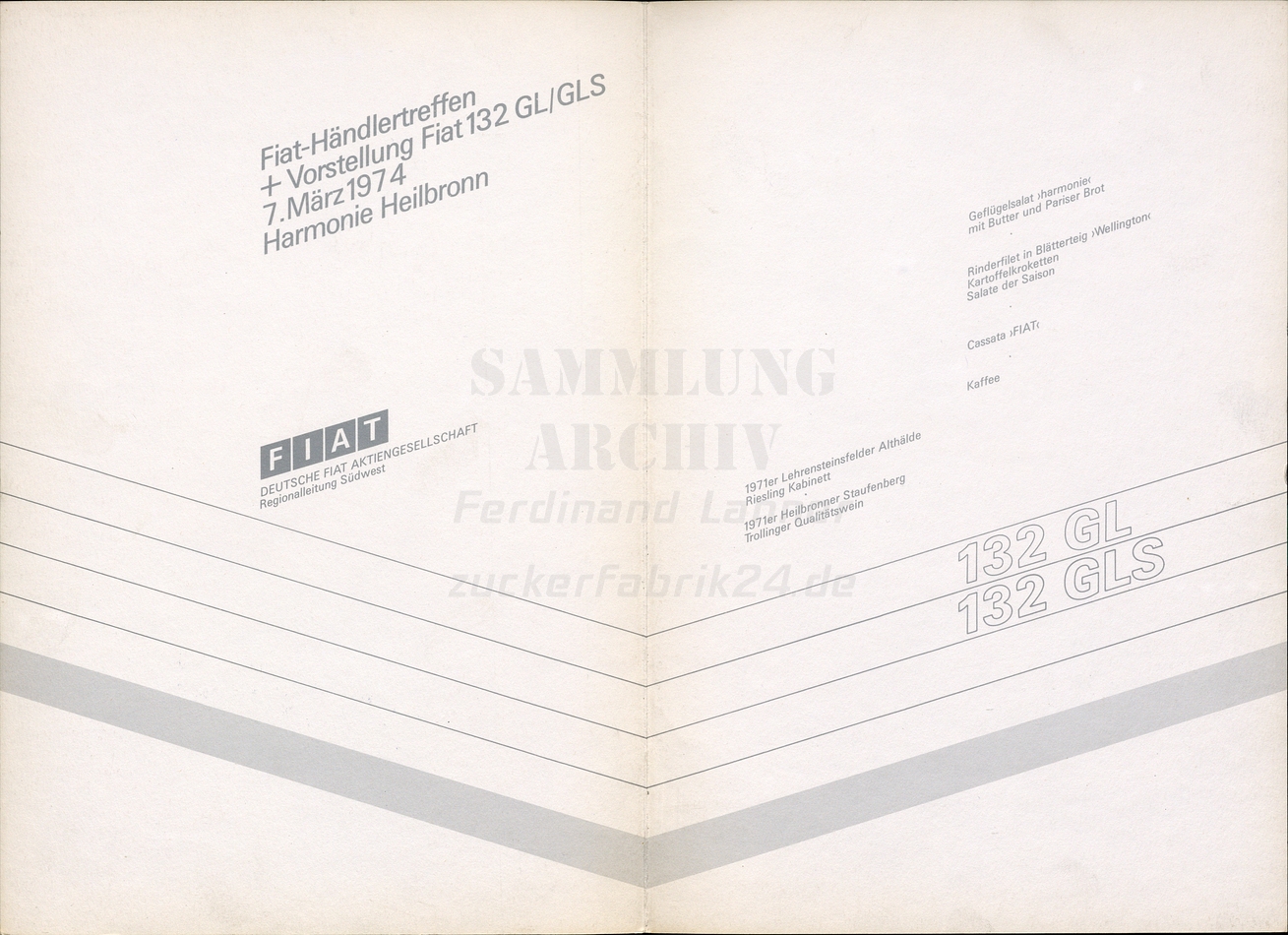 Geflügelsalat, Beef Wellington und Cassata zur Händler-Vorstellung des Fiat 132 GL/GLS - 1974