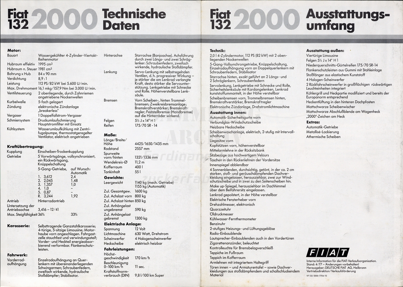 1977 wurde mit einem weiteren facelift, außen und im Innenraum, der Fiat 132 mit 2 ltr. Motor, der '132-2000' vorgestellt (1995 ccm, B/H 84mm/90mm). Der Motor 1800 blieb noch in Jahr im Angebot, für die Version Fiat 132 Automatic, ab 1978 gab es den Fiat 132-2000 mit (modifizierter) GM 3-Gang-Automatic. - Seat in Spanien baute den 2,0 ltr Motor (angeblich aus steuerlichen Gründen) mit Hub 86,6 mm und 1919 ccm Hubraum. - Beim Fiat 132-2000 war Servolenkung, elektr. Fenterheber u.a. sereinmäßig, auf Wunsch war ein Stahlschiebedach lieferbar. - Der Motor 1600 war in einigen Märkten weiterhin erhältlich.