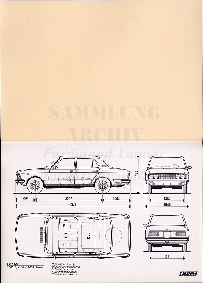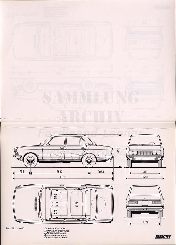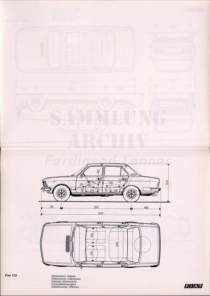 Presse- u. Händlerinformation Fiat 132 - Zeichnungen, Daten - 6-1972