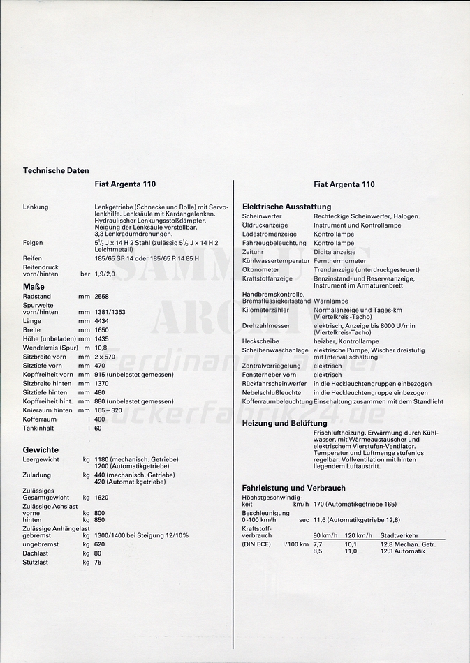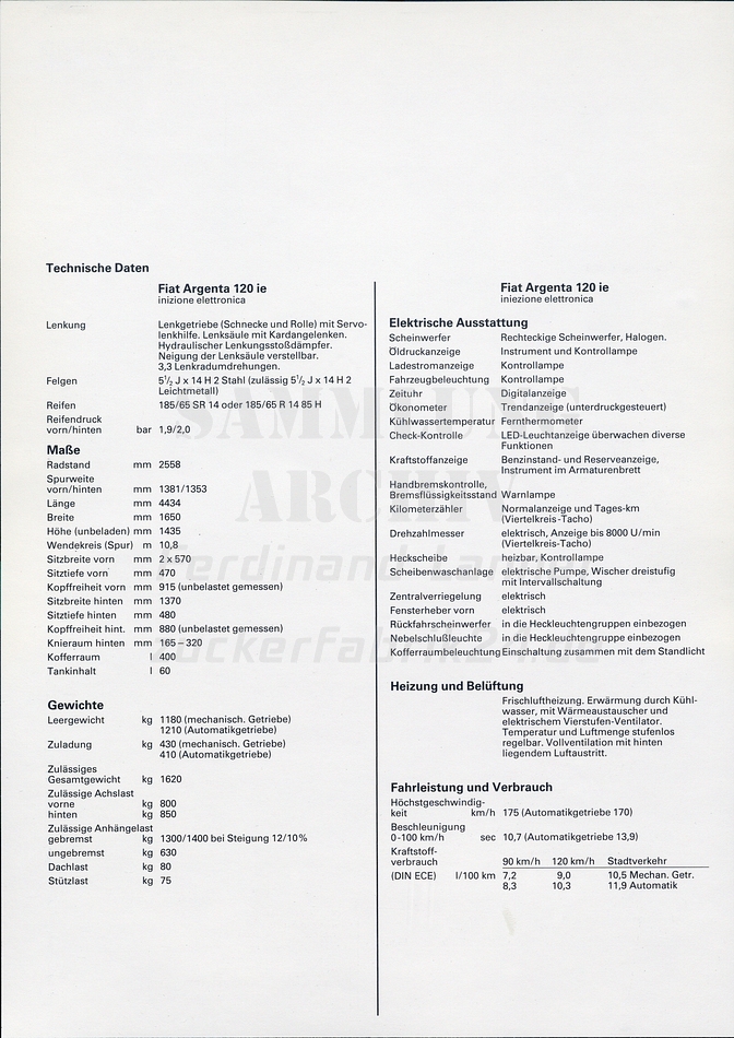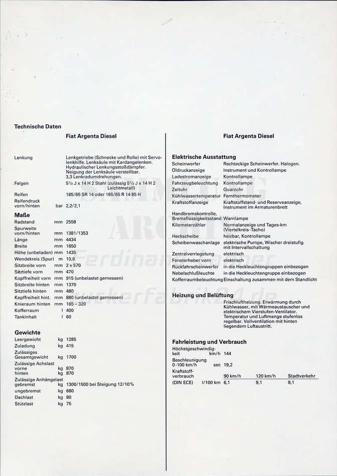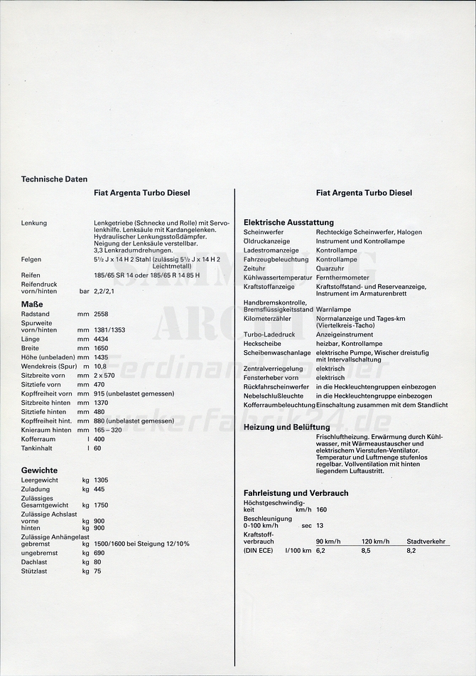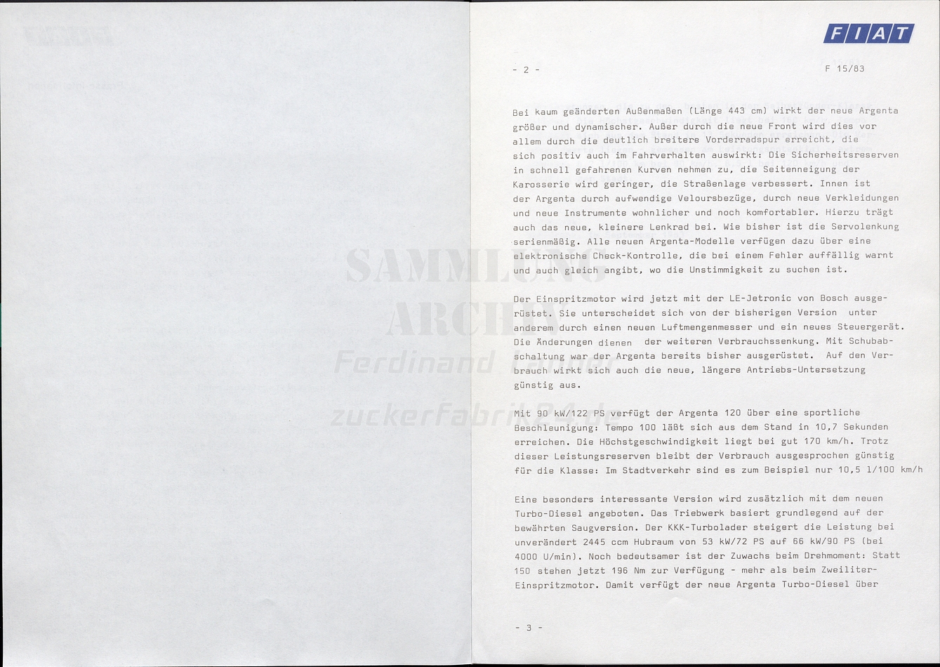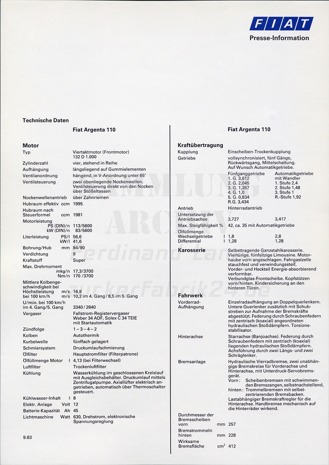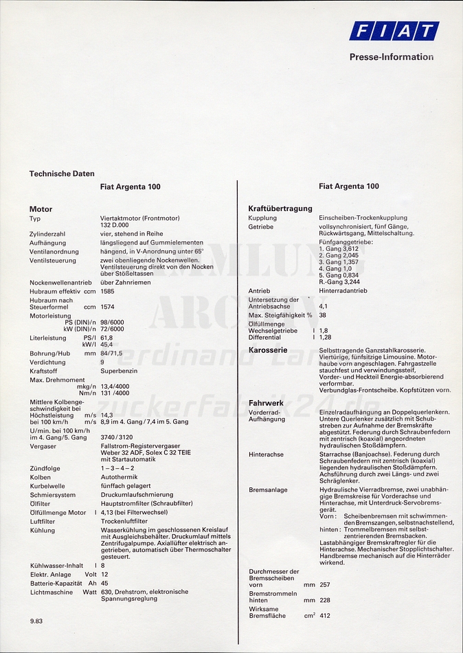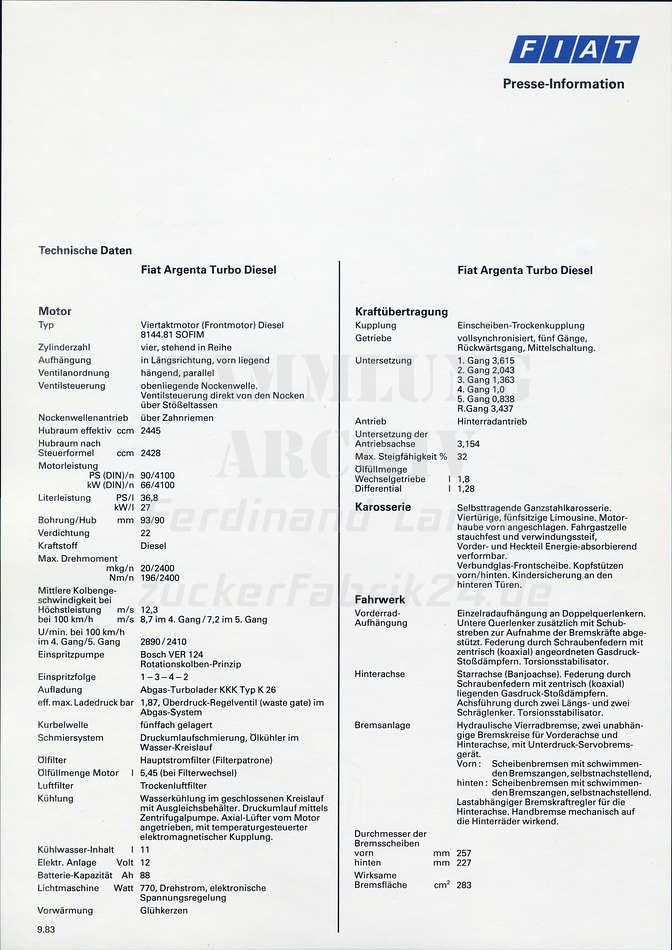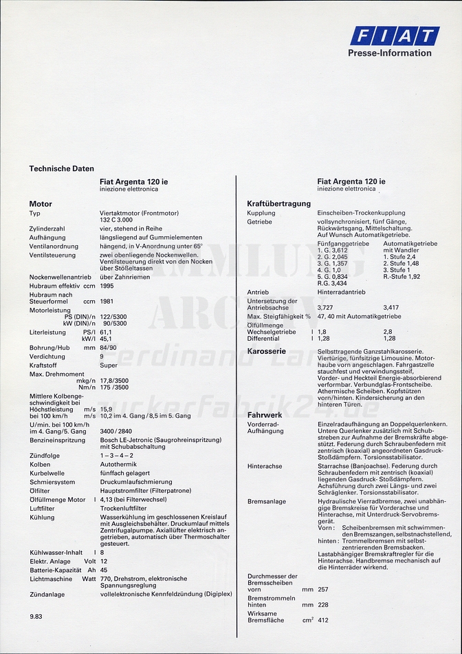 Presseinformation - techn. Daten Fiat Argenta 100, 110, 120 ie, Disel, Turbo Diesel - 9-1983 - IAA-D