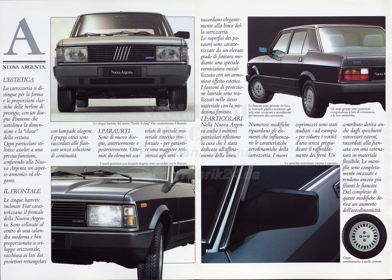 1977 wurde die innen und außen modifizierte Version mit 2,0 ltr Motor als Fiat 132-2000 vorgestellt. 1978 folgten Fiat 132 Diesel 2000 und Diesel 2500, 1979 Fiat 132-2000 Injection mit Benzineinspritzung. - Im April 1981 wurde der Fiat 132 komplett überarbeit und als 'Fiat Argenta' (1600, 2000, 2000ie, 2500 Diesel) vorgestellt. 1983 kam eine weitere Modifizierung an Karosserie (Grill ua.) und Fahrwerk, Motor mit LE-jetronic, und neue Motoren 2000 Volumex und 2500 turbodiesel hinzu.